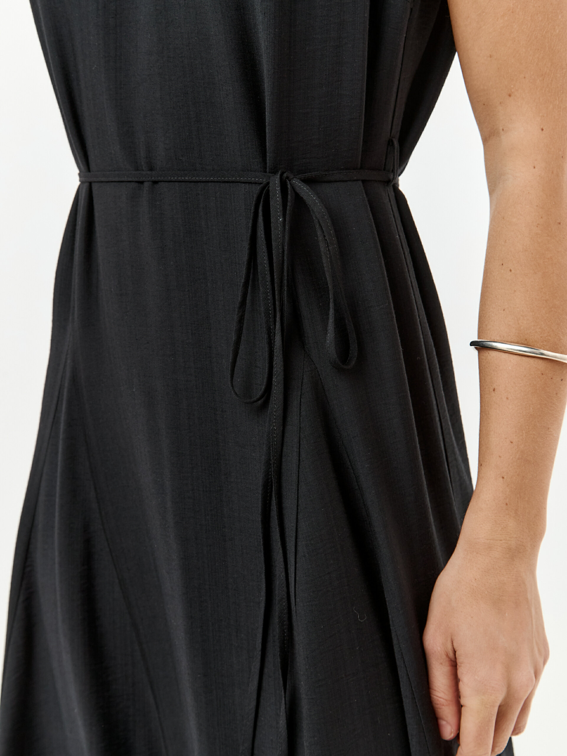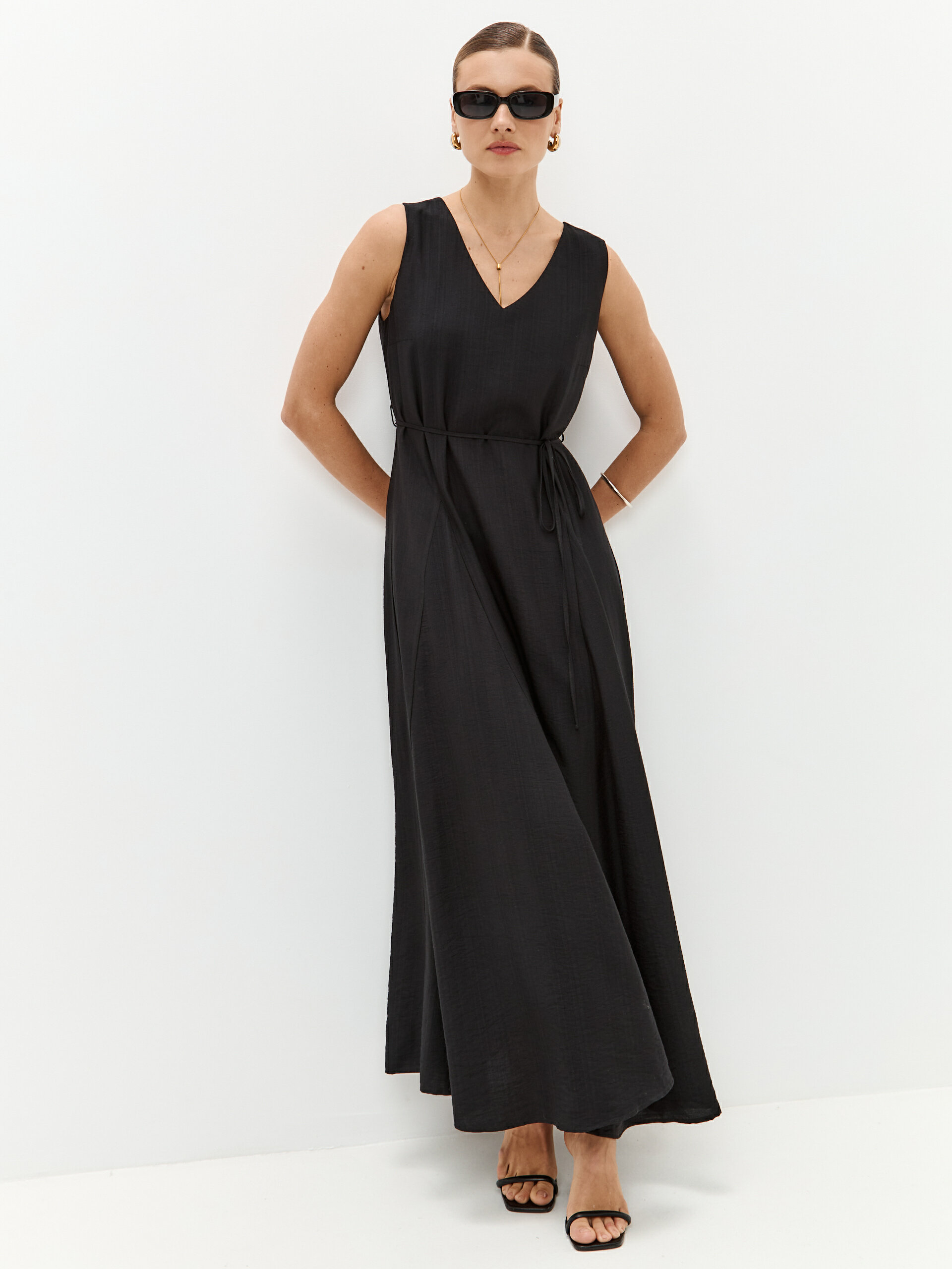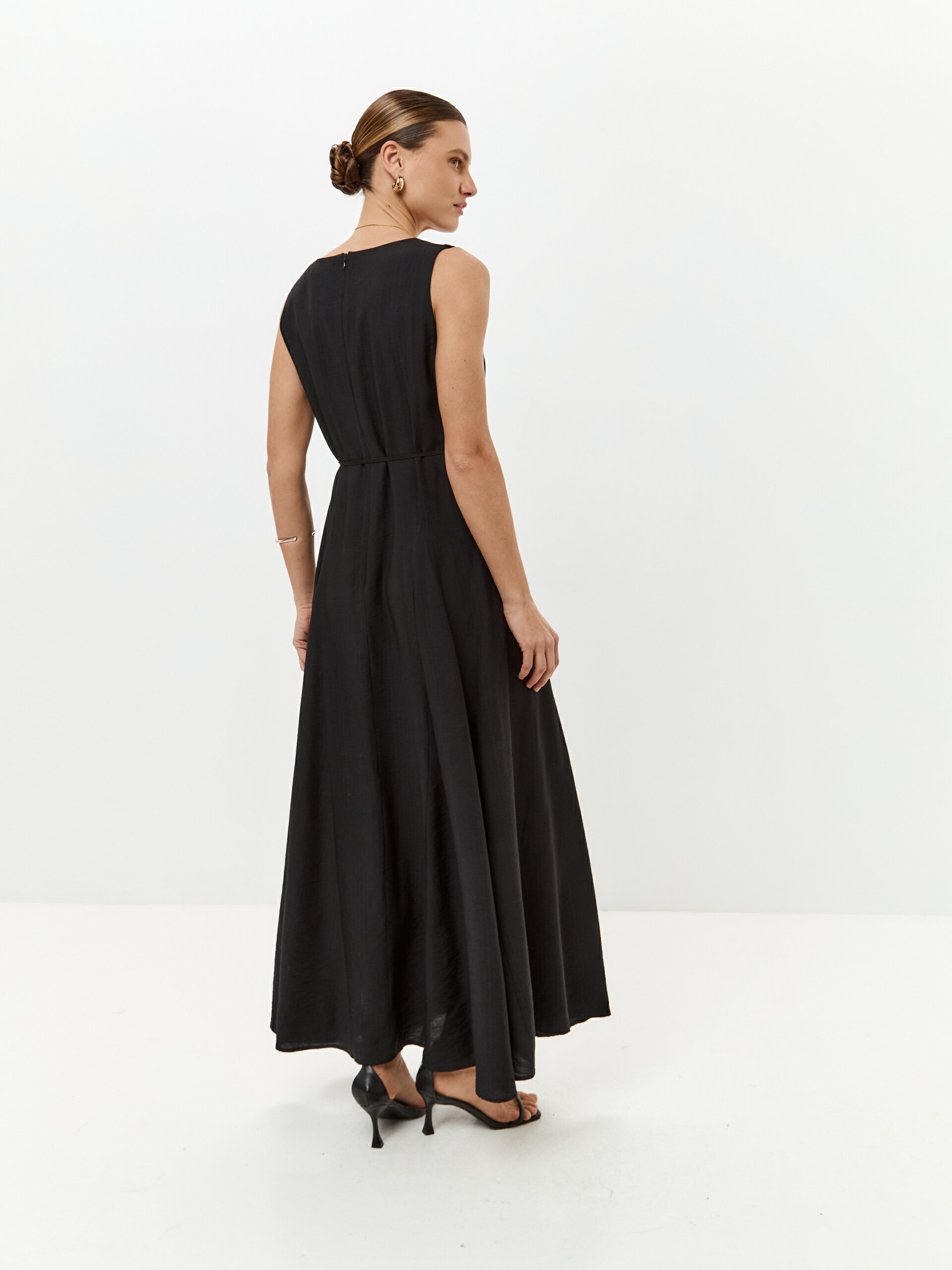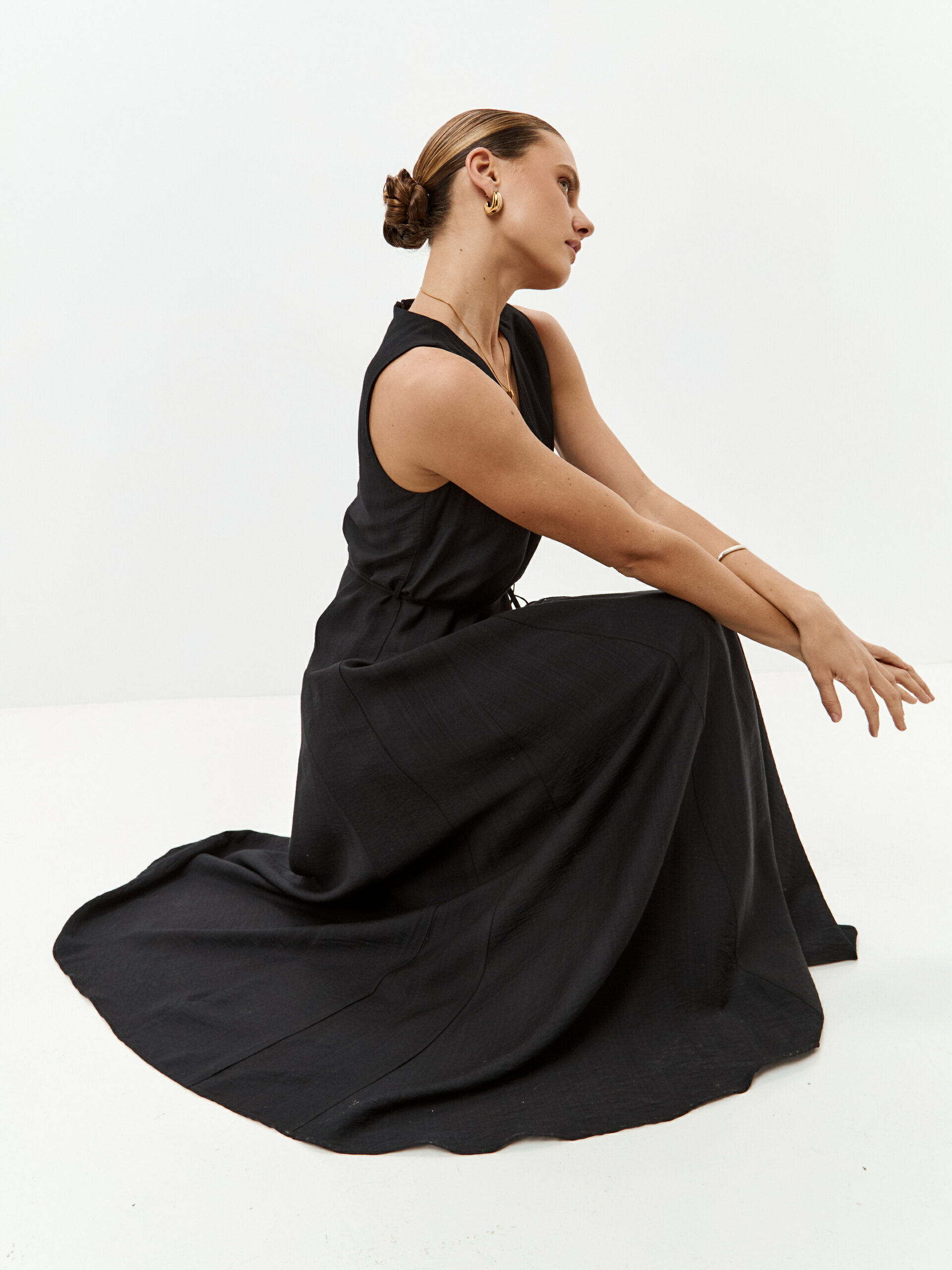 В юбку вшиты клинья, благодаря чему платье красиво струится в движении — без лишнего объема, но с ощущением легкости и динамики.