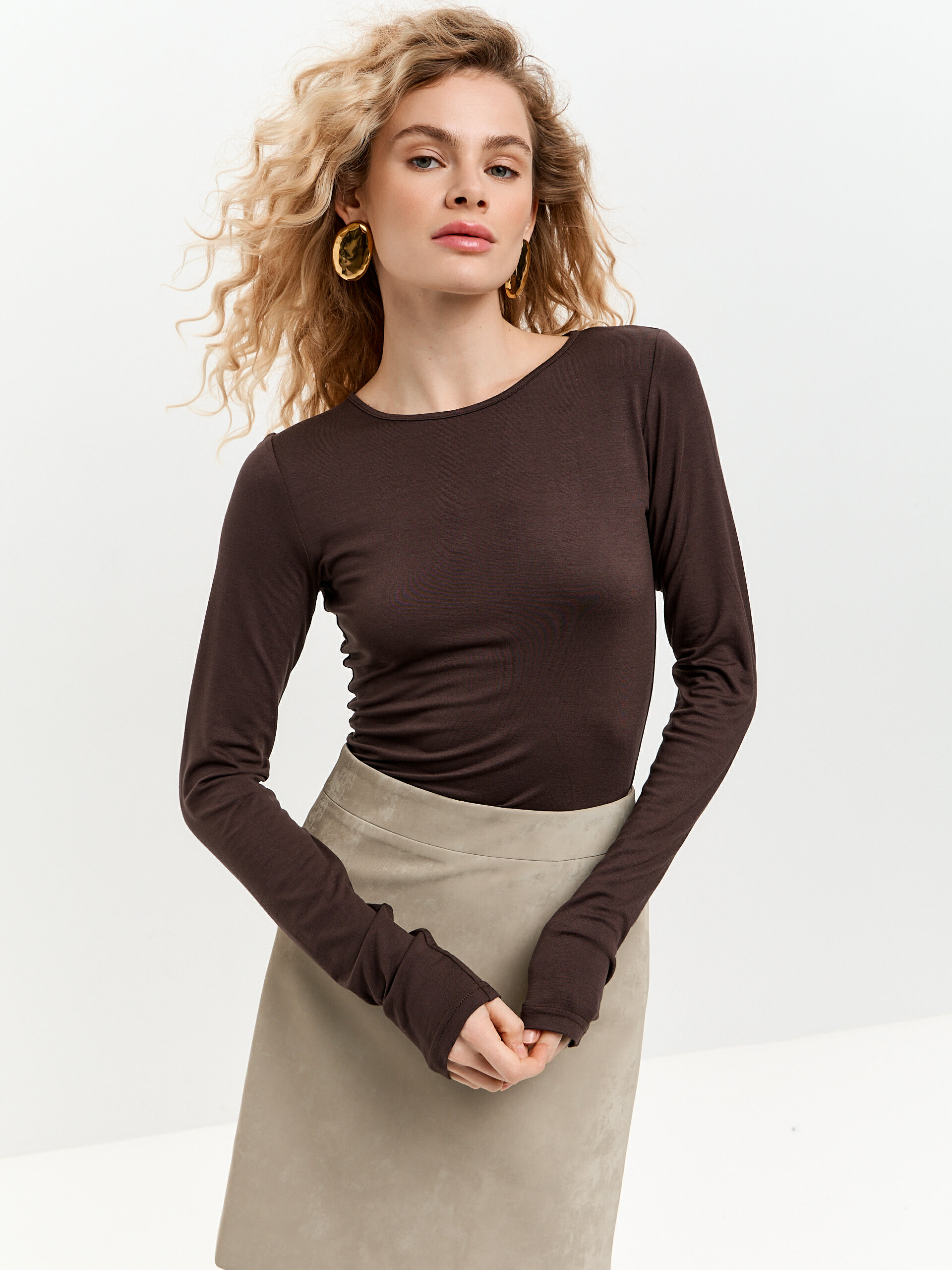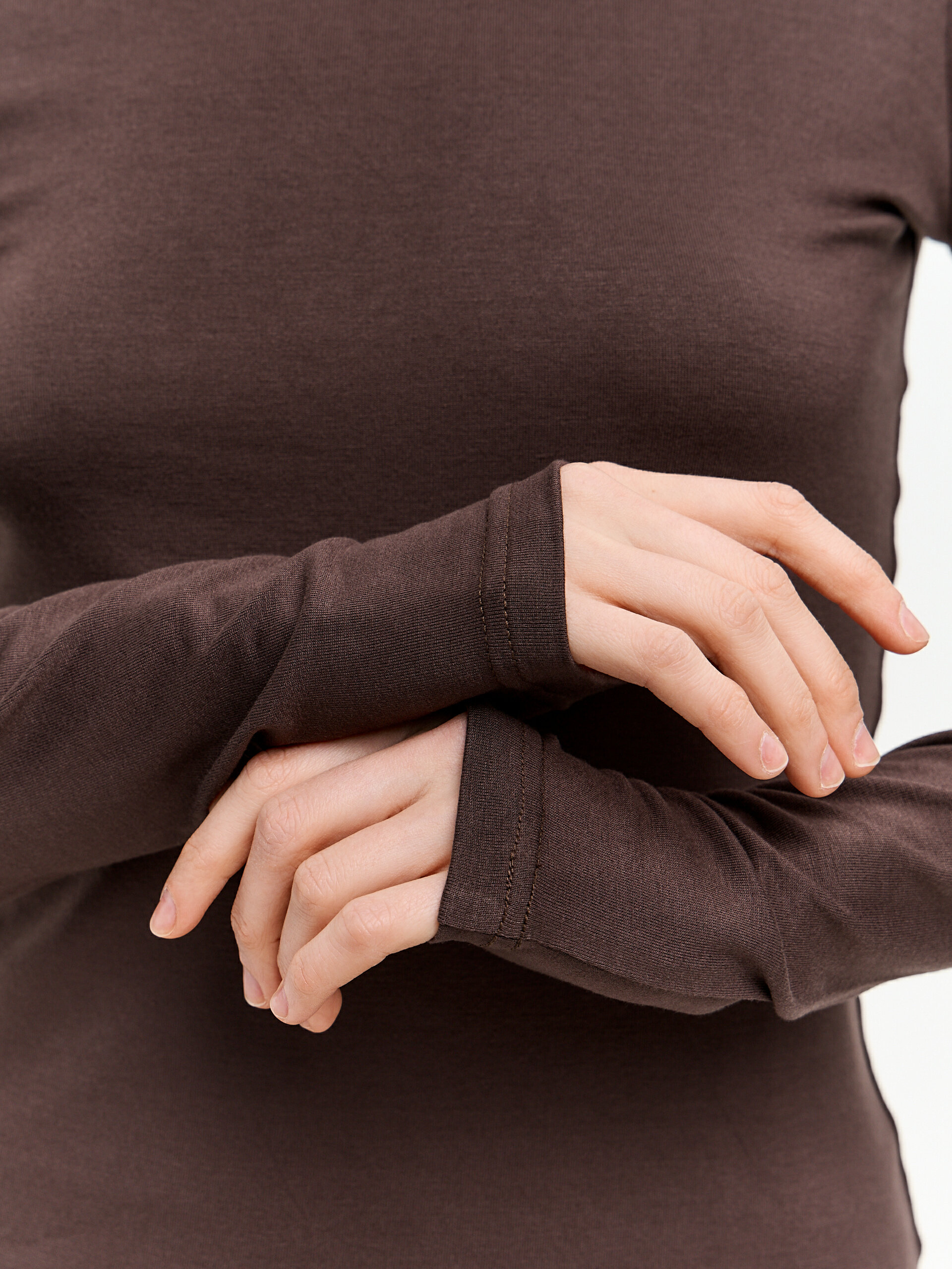Обратите внимание на раздел "С этим также заказывают" ниже – чаще всего шоколадный лонгслив сочетают с бежевыми костюмами для высоких.