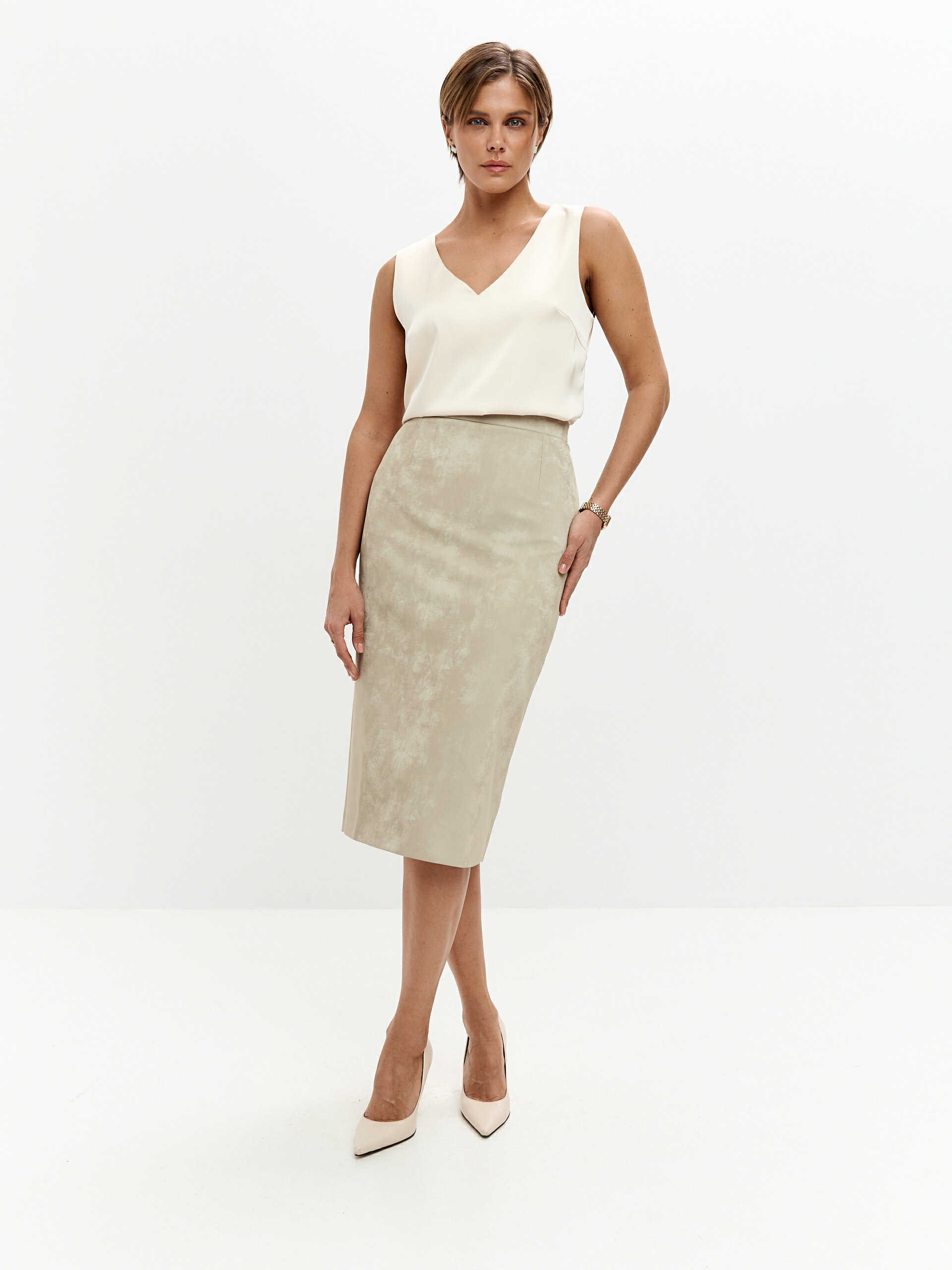 Юбка-карандаш ниже колена. Звучит просто, но если ваш рост выше 180 см, вы знаете, как сложно найти ту, что действительно ниже колена, а не задирается выше при первом шаге. Мы создали юбку для высоких, которая останется элегантной и на каблуках, и в обуви на плоском ходу.